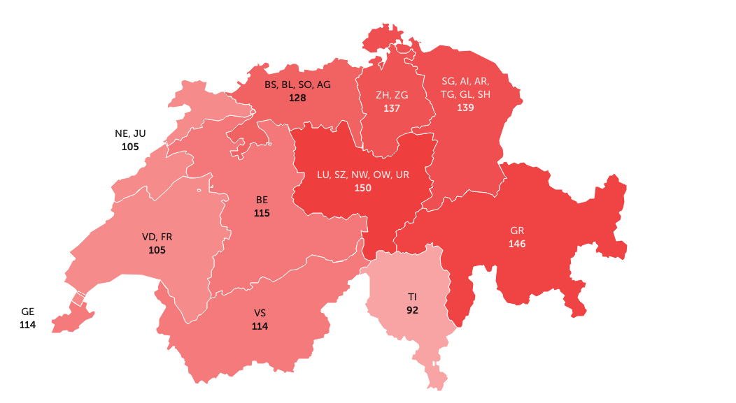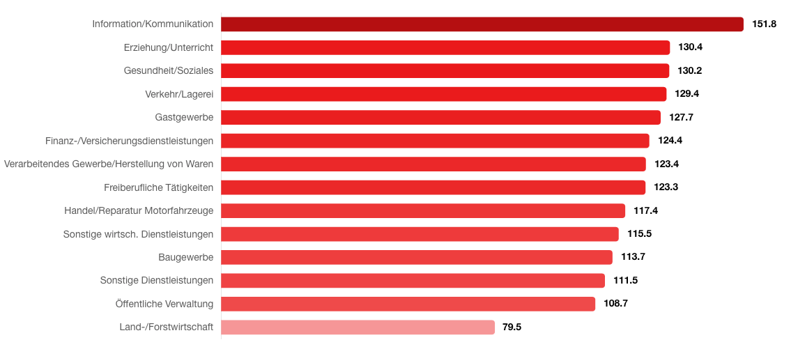 Der Rückgang des Fachkräfteindex im Vergleich zum Vorquartal ist primär auf eine Zunahme der Arbeitslosenquote und eine Abnahme der Quote der offenen Stellen zurückzuführen. Die Fachkräftesituation hat sich gemäss Fachkräfteindex in fast allen Branchen im Vergleich zum Vorquartal entschärft (Ausnahmen: Öffentliche Verwaltung sowie Erziehung und Unterricht). «Information / Kommunikation» weist mit 152 Punkten wie im Vorquartal den höchsten Indexwert auf. Die Entspannung bei der Fachkräftesituation im Vergleich zum Vorquartal ist auch in fast allen Regionen zu beobachten (Ausnahmen: NE, JU sowie SG, AI, AR, TG, GL, SH). Die Region «LU, SZ, NW, OW, UR» weist mit 150 Punkten den höchsten Indexwert auf und löst damit die Region «Graubünden» (neu 146 Indexpunkte) ab, die bisher über alle Beobachtungszeitpunkte den höchsten Indexwert aufwies.